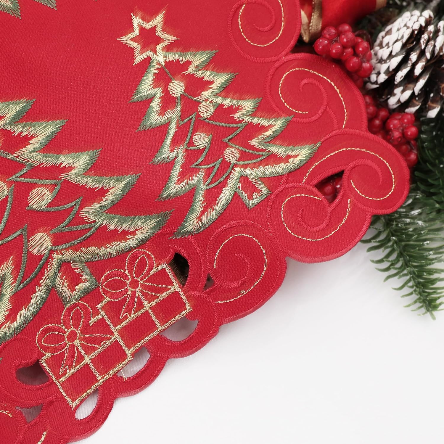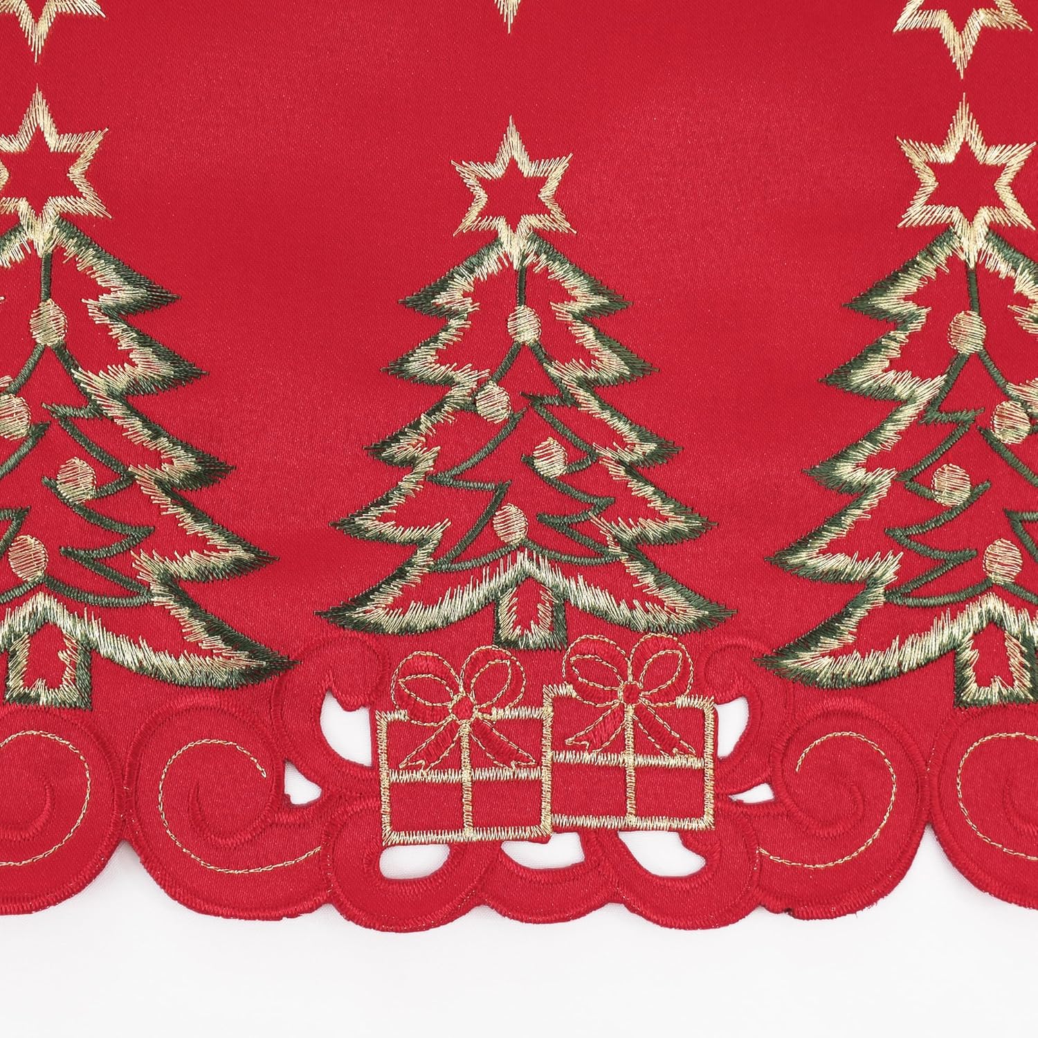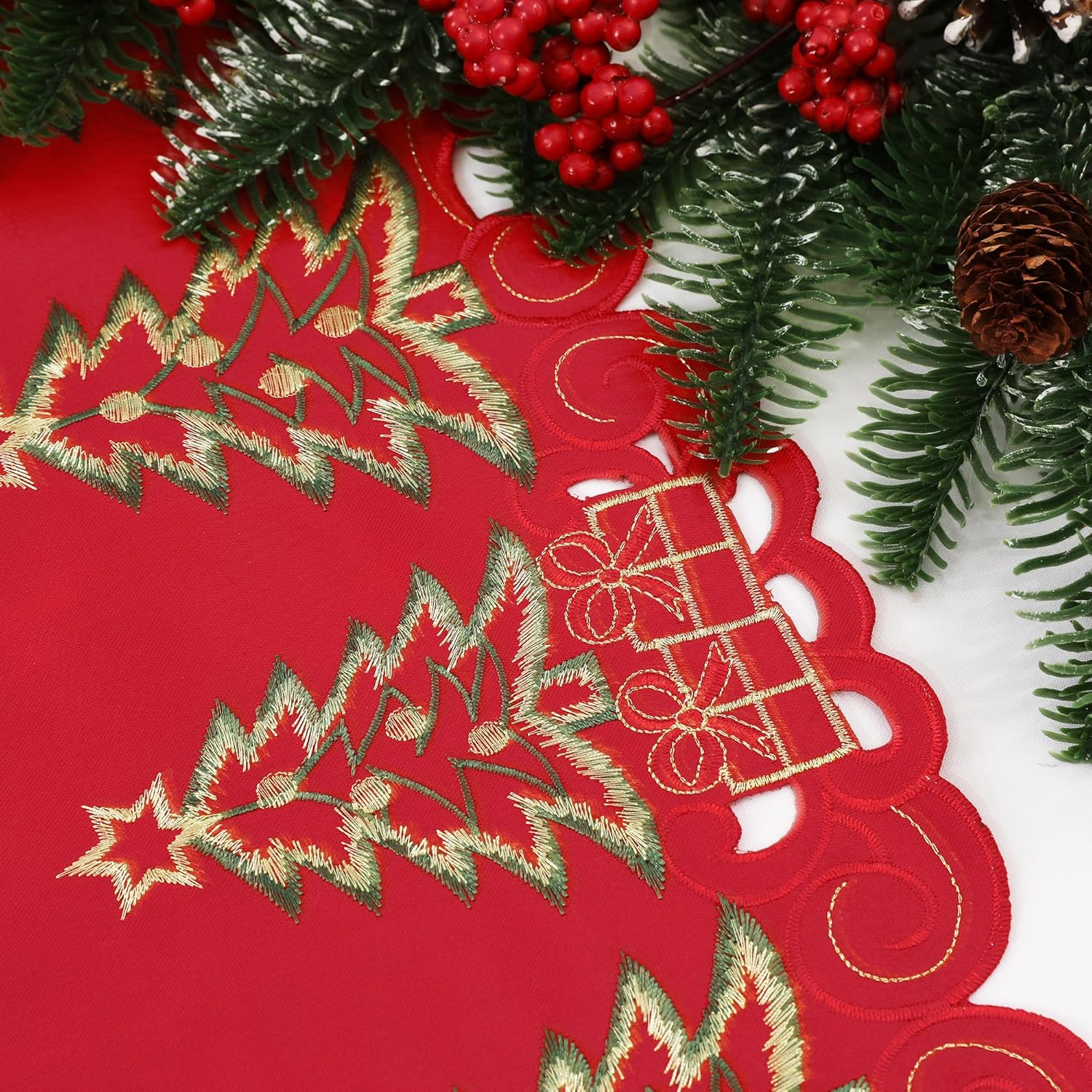 🎄Creative Design: The Christmas table runner features beautiful embroidery of red Christmas tree and gifts, which are intricately woven into the soft fabric to create a stunning design. The colors used in the embroidery are mostly warm shades of red and green. Delicate gifts and Christmas tree make a perfect Christmas decor.