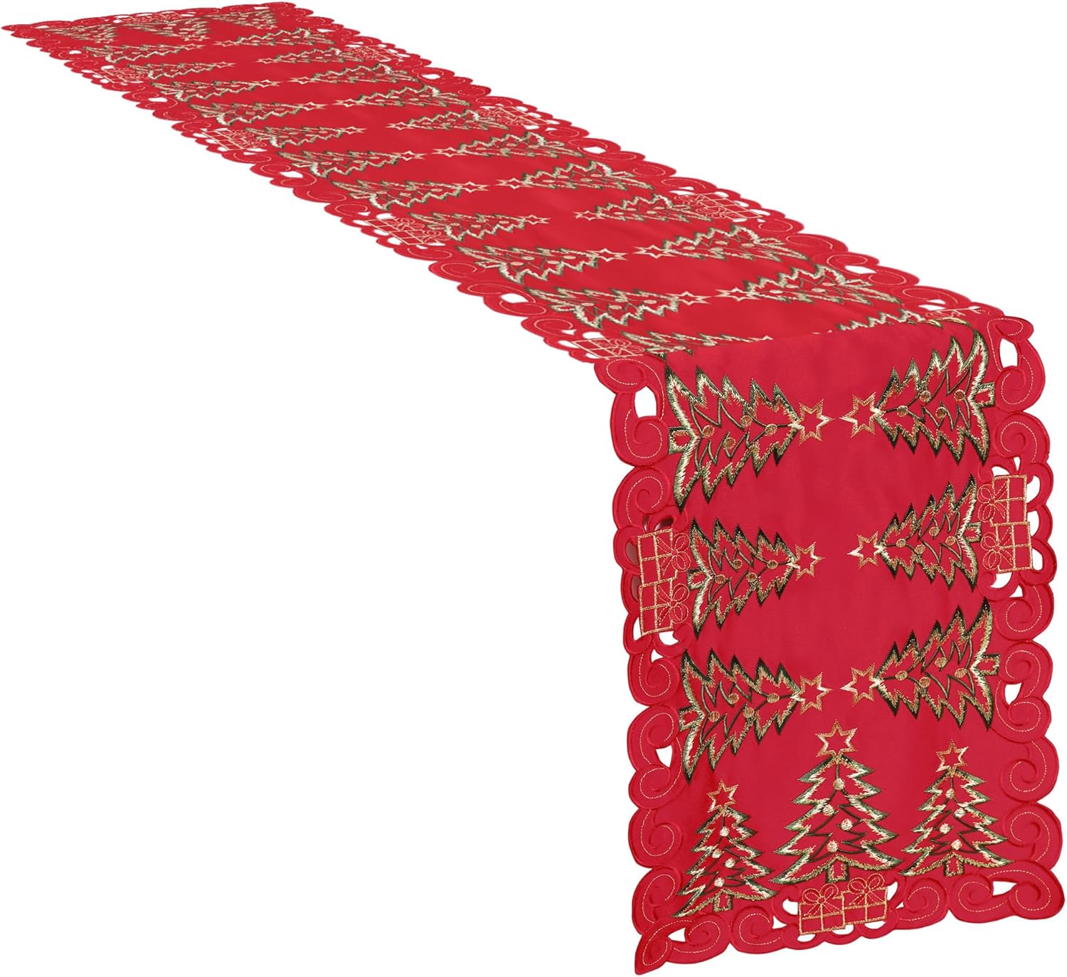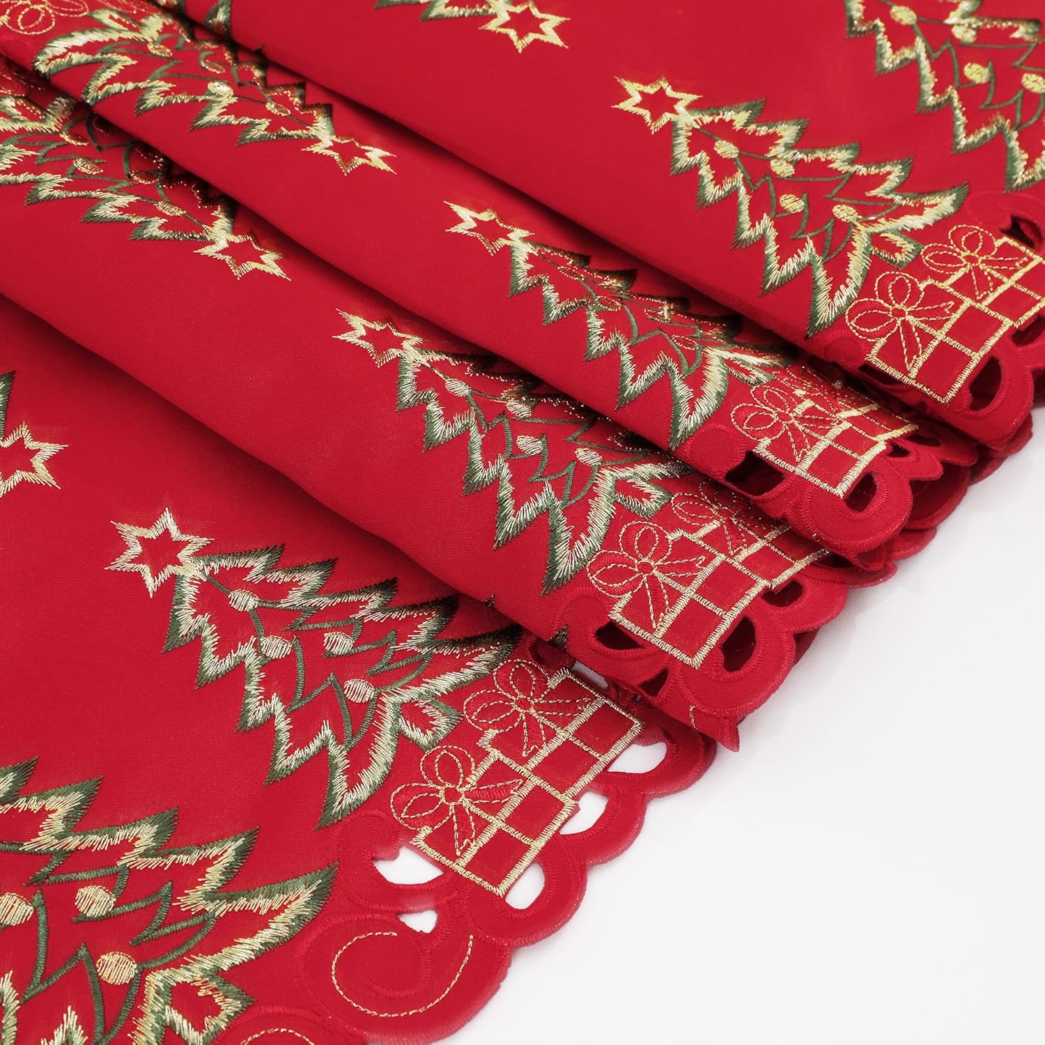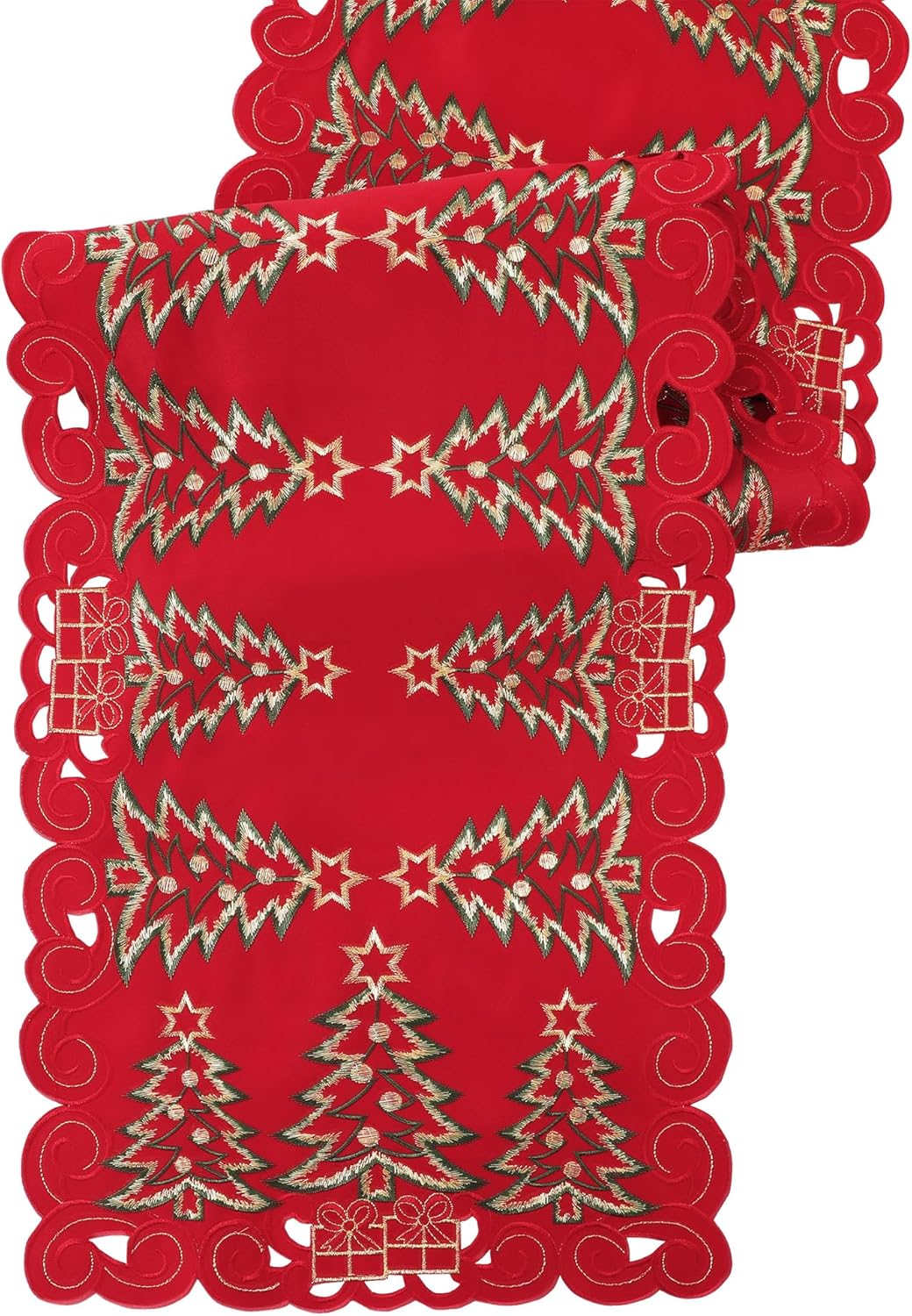 🎄Creative Design: The Christmas table runner features beautiful embroidery of red Christmas tree and gifts, which are intricately woven into the soft fabric to create a stunning design. The colors used in the embroidery are mostly warm shades of red and green. Delicate gifts and Christmas tree make a perfect Christmas decor.