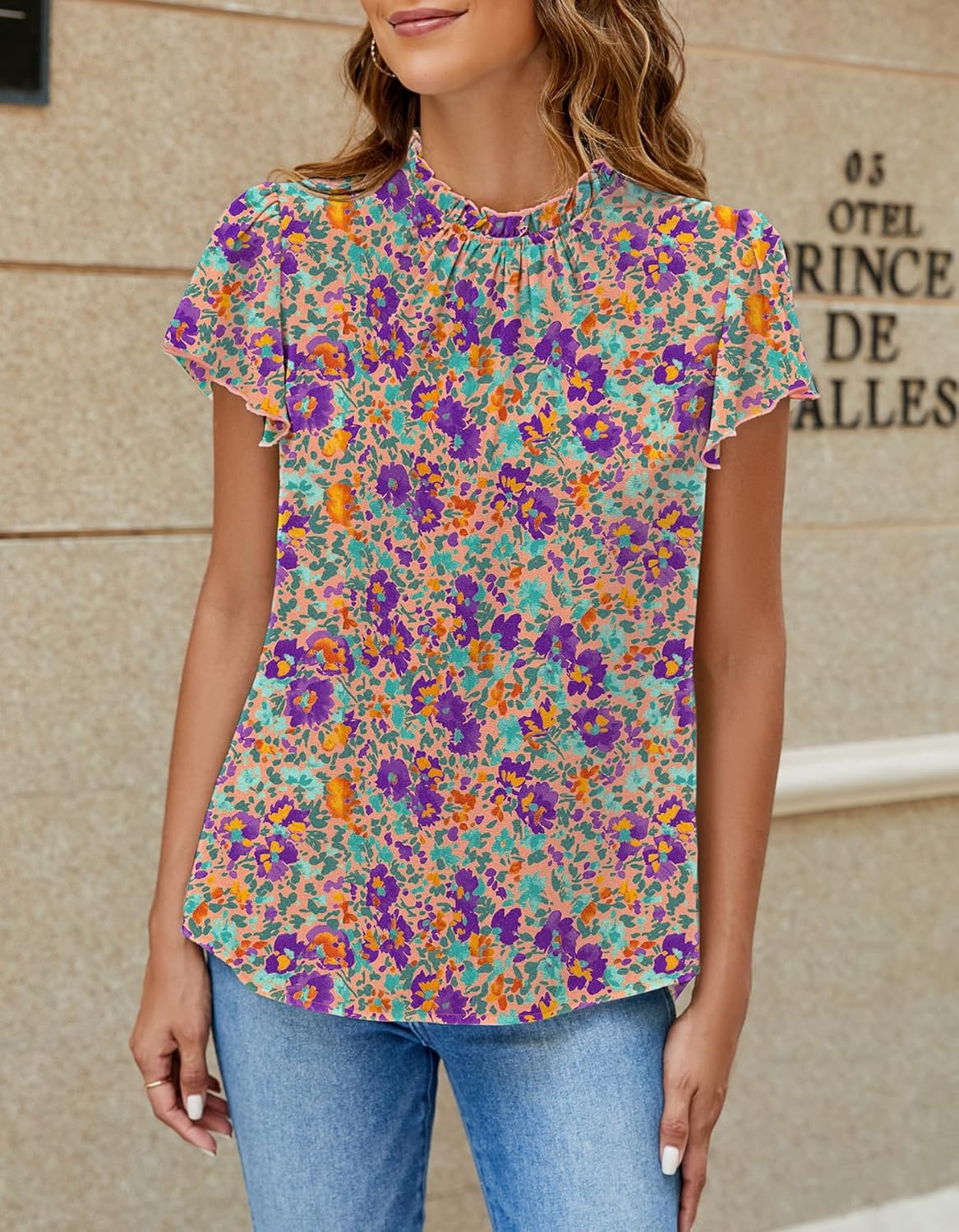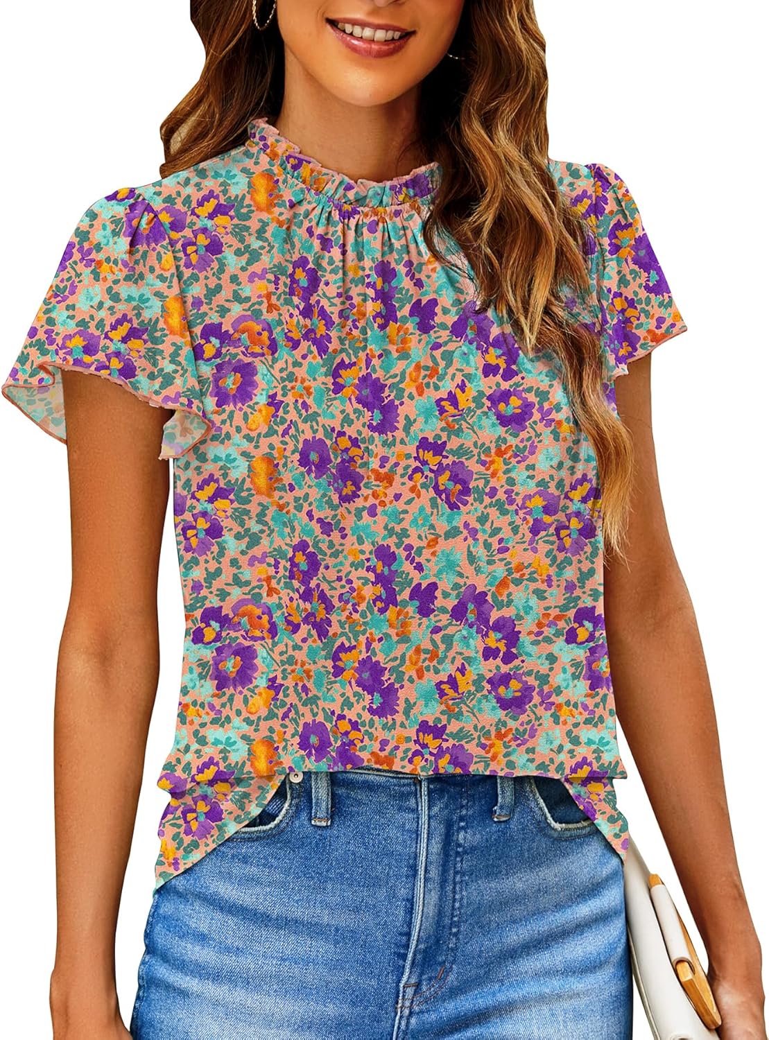 Mock Neck With Frilled Trim Detail / Keyhole Back / Ruffle Short Sleeve / Boho All Over Floral Pattern / Bohemian Style /Womens Summer Tops / Casual Shirt For Ladies / Elegant And Chic StyleElegant Boho Shirt for Women / Mock Neck Blouse / Blouses for women fashion / Short Sleeve Tops Work
