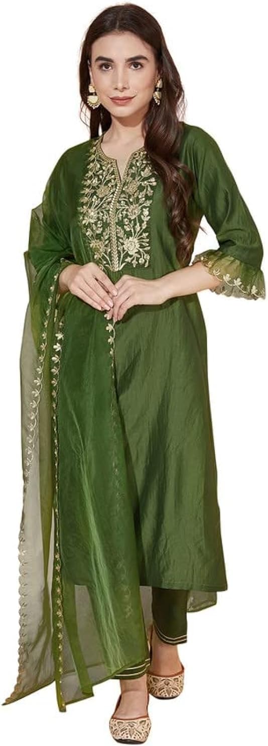 SIRIL Women’s Embroidery Chinnon Silk Straight Kurta Set with Dupatta