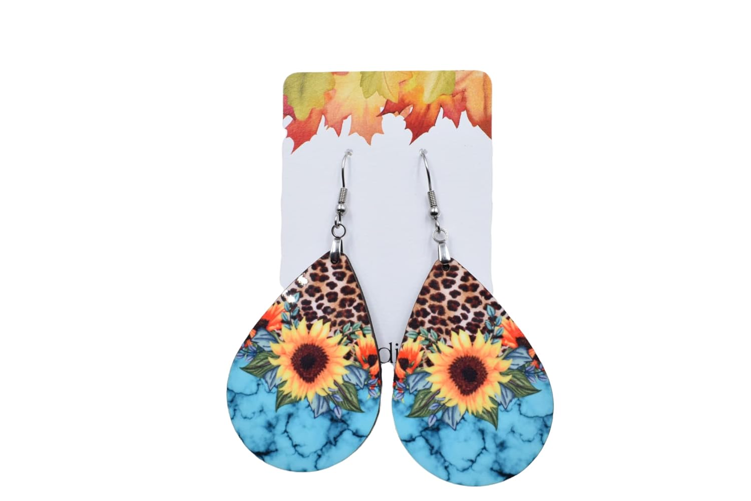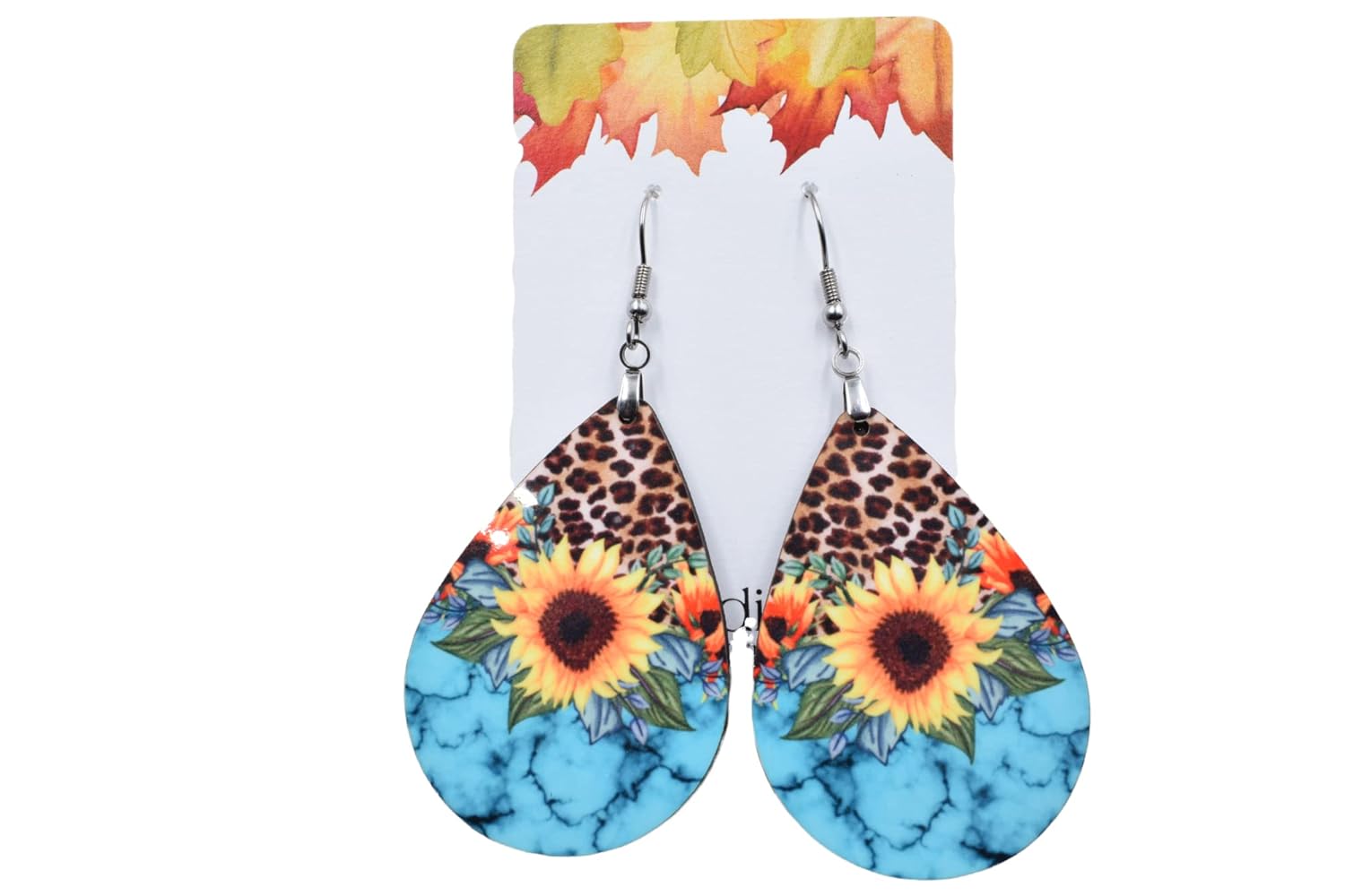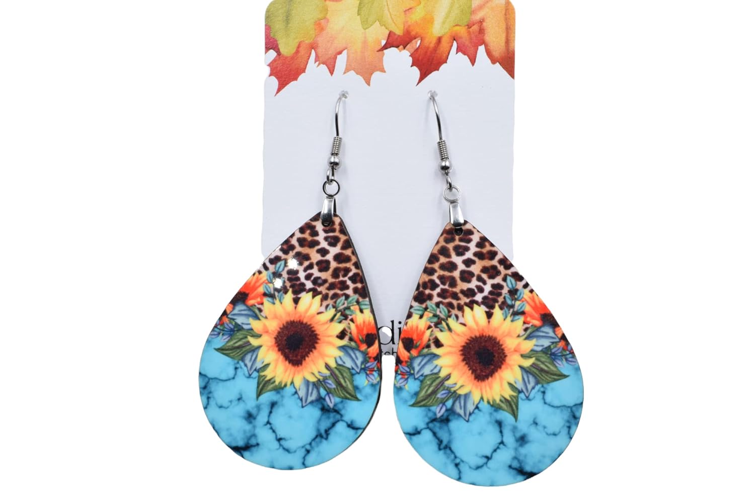 Sunflower Turquoise and Leopard Teardrop Earrings – Farmhouse Flower Earrings – Large Statement earrings Size – size is 1.5″ long and They are 1/8″ thick. Image is printed on one side. These are made form MDF – laser cut then sublimated with the image – Super cute and fun accessory for everyday. Earring findings are Stainless steel. These come in a gift box for protection during shipping and easy gifting!