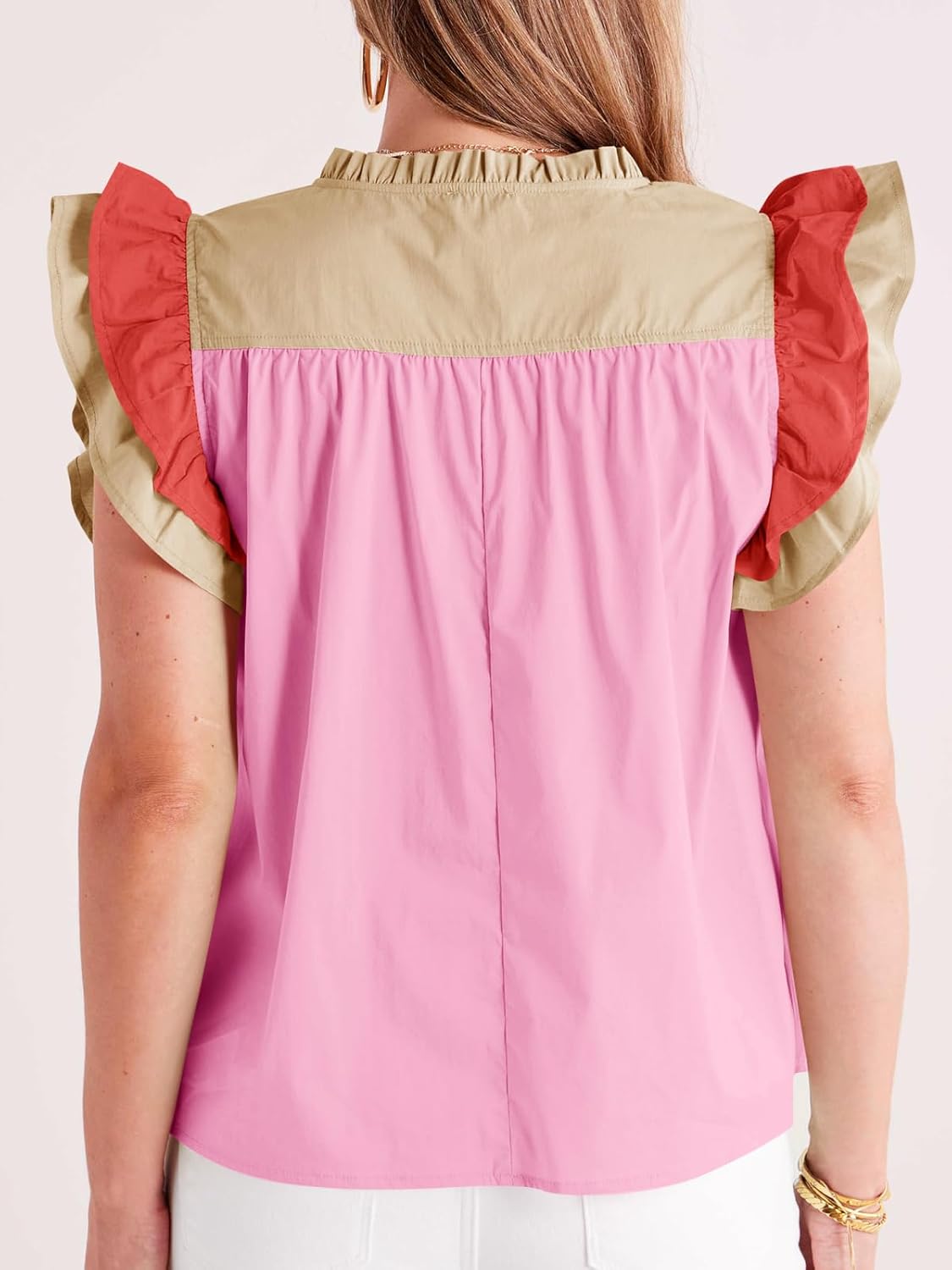 Detail Shows: Color Block V Neck, Ruffle Sleeveless, Hem Design And 100% Cotton.