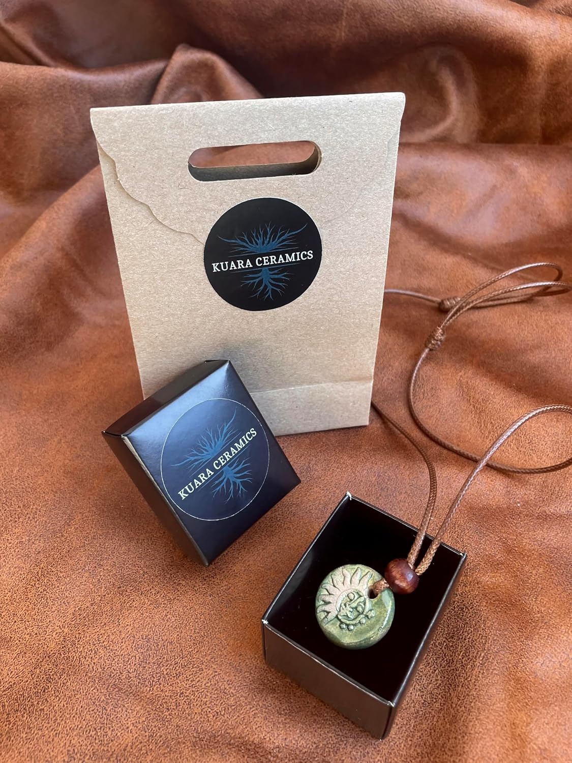 The Sun and Moon Pendant is handcrafted from clay and biscuit fired in a kiln that reaches 1900°F. After the initial firing, the pendant is coated with lead free, food safe glaze and fired for a second time for the Glaze Firing process. After the second firing, the Pendant matures into its final form. The pendant is tied using a brown, durable Korean Knotting Rope to form an adjustable knot. Many cultures and religions symbolize the Sun and Moon as symbols of rebirth, dreams and creativity. The Sun represents immortality, permenance and masculine energy while the Moon represents recurrence, femininity and rebirth. Parallel to Yin and Yang symbol, the Sun and Moon represents balance and harmony between light and darkness. This symbol is valued in mysticism and work as a spiritual symbol.