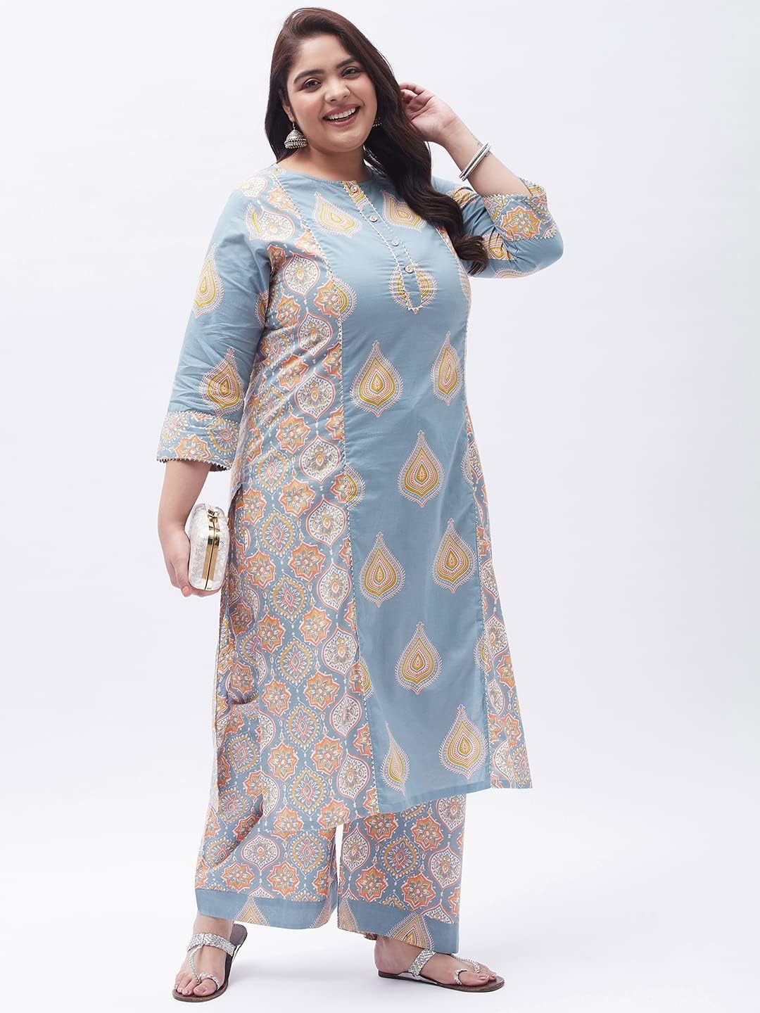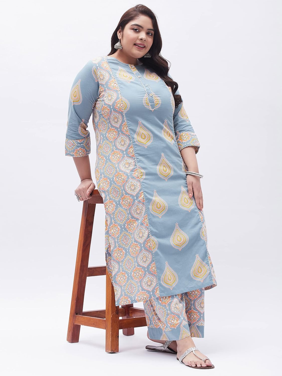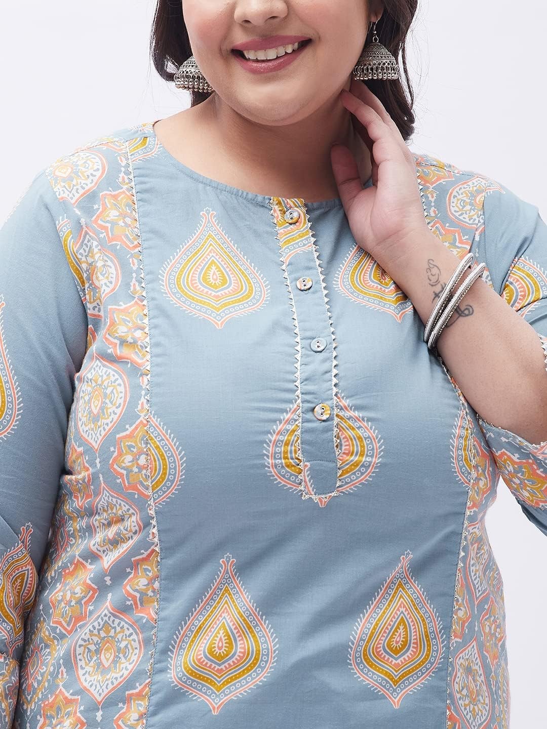 Our collection includes different styles of straight kurti, kurta palazzo set, kurta trouser set, for casual and festive occasions that cater to a wide variety of the wardrobe requirements of the Indian women.Tissu Clothing Presents Women’s Grey Floral Printed Straight Kurta with Palazzos Is An Exclusive Ethnic Wear Manufactured Keeping In Mind The Taste And Preference Of Today’s Women. Inseam Length Of Palazzos Is 23 Inches, And the Outseam Length is 38 Inches For All Sizes. Palazzo Has Elasticated Waistband With Drawstrings For Comfort Fit. Featuring Calf Length With 3/4 Sleeves And Round Neck. This Kurta Set Is Made From Cotton Fabric. It’s Very Soft And Skin Friendly. This kurta has openable Front Buttons and side slits. You Will Always Be The Center Of Attraction Of Any Gathering By This Kurta Set. This Kurta Set Will Add Extra Class To Your Looks. This Can Be A Perfect Selection For You.