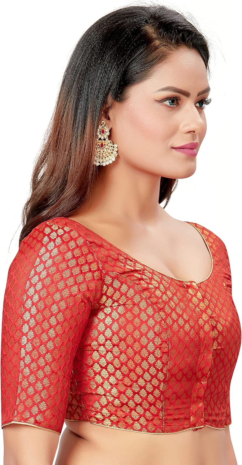 This is Madhu Fashion’s New Banaras Brocade Readymade Saree Blouse. It is an Elbow Length Blouse with Gold Piping on the Sleeves. This is a Front Opening Blouse with Round Neck Type. This is a Ready to Wear Saree Blouse that can be worn with any Contrast Coloured Saree. Available in Multiple Colors & Sizes.