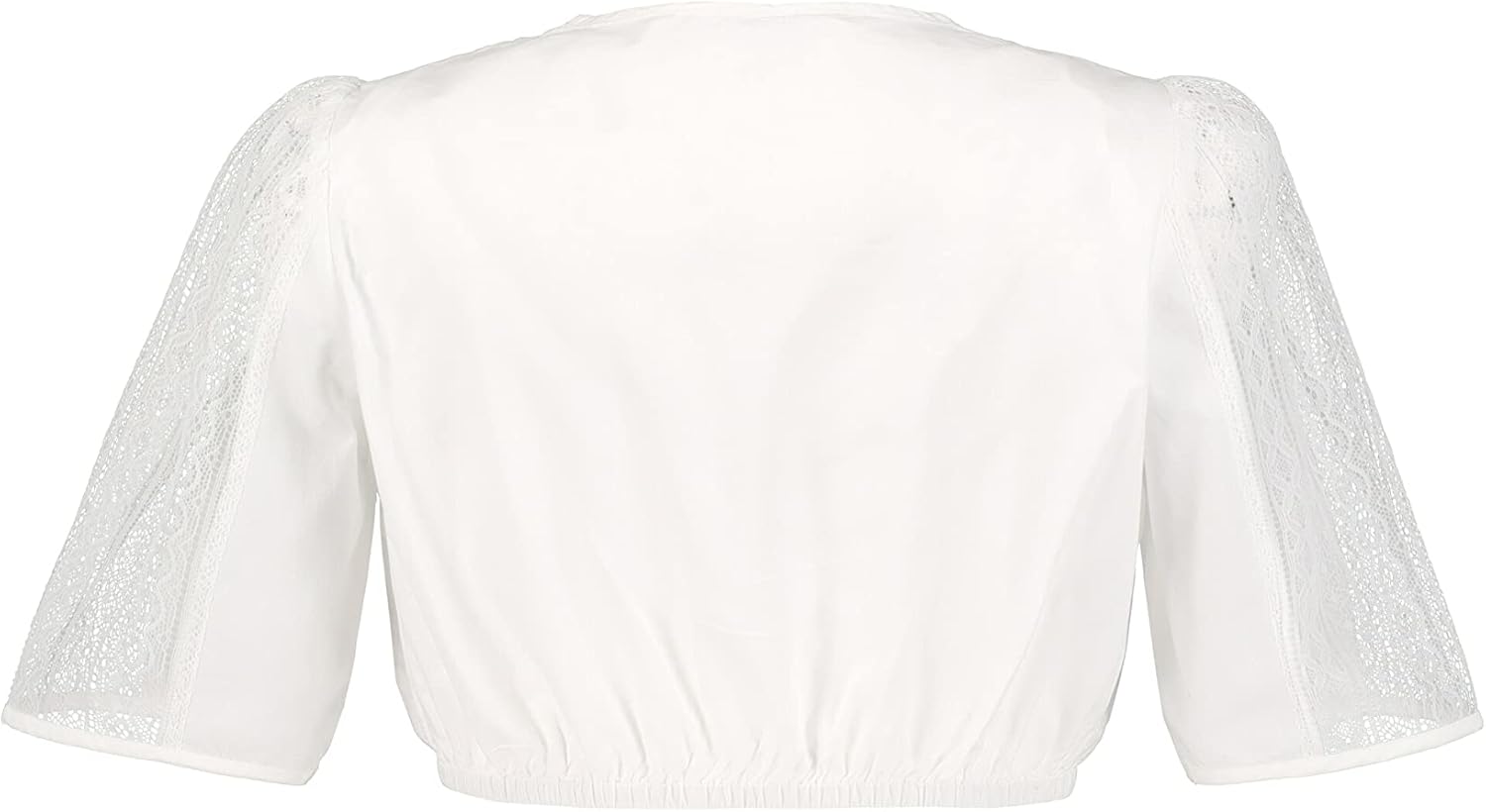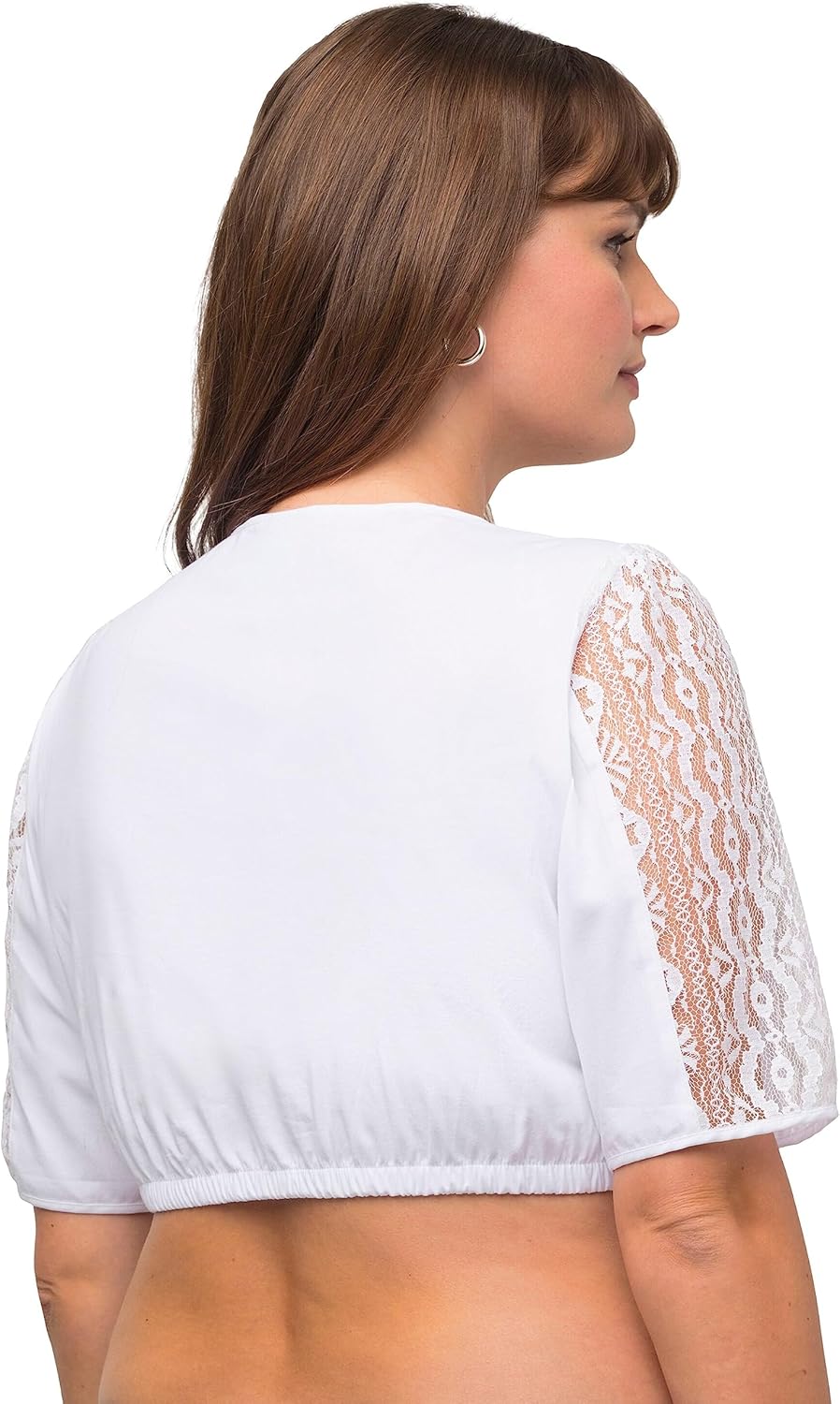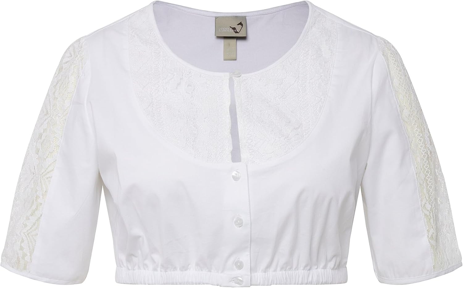 Lace Detail Dirndl Blouse A high cropped style featuring sheer lace inserts on the sleeves and a rounded lace collar with a dramatic slit.