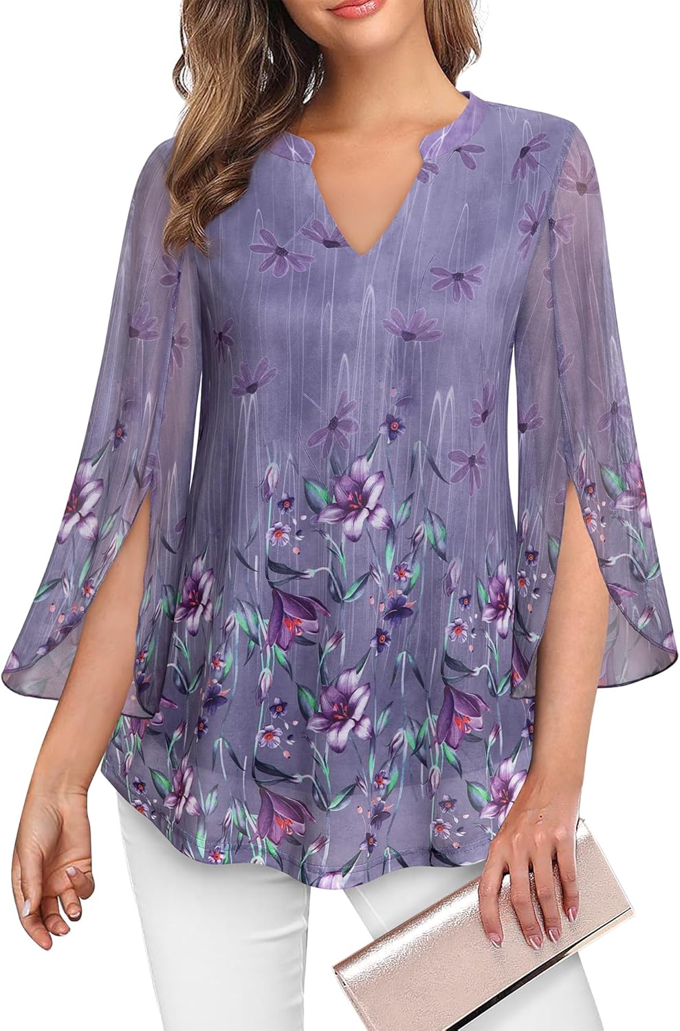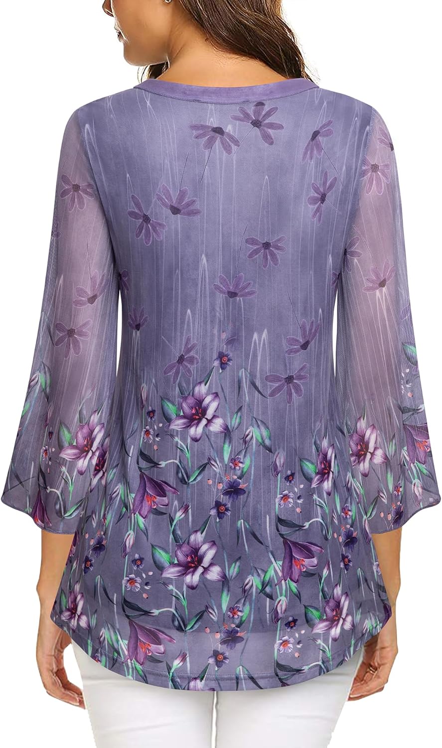 VALOLIA Women’s 3/4 Sleeve Floral Tunic Tops V Neck Double Layers Loose Fit Mesh Blouses Shirt