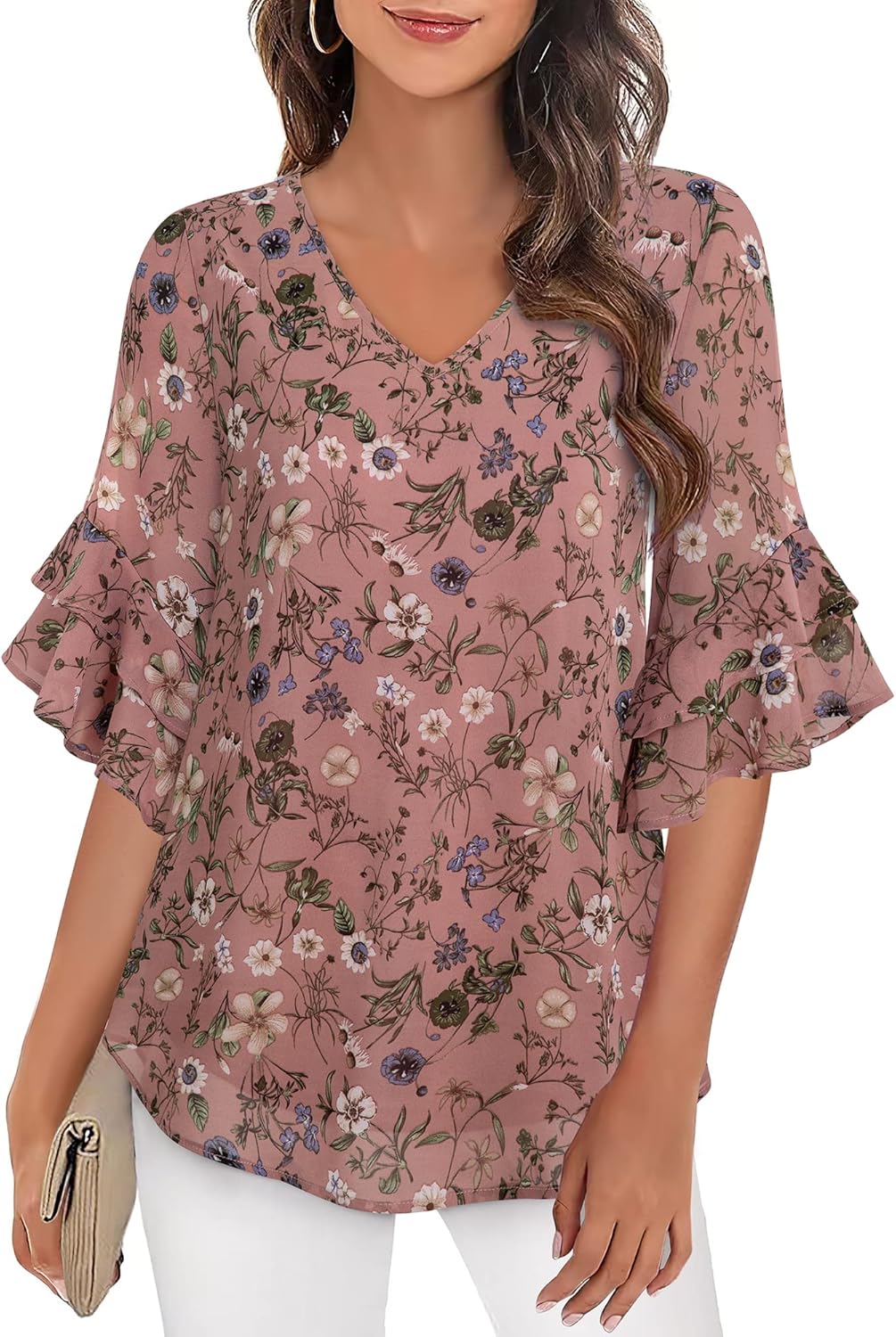 Beautiful, hidden in clothes. Women's V Neck 3/4 Sleeves Flowy Chiffon Shirts BlousesWomen's V Neck 3/4 Sleeves Flowy Chiffon Shirts Blouses