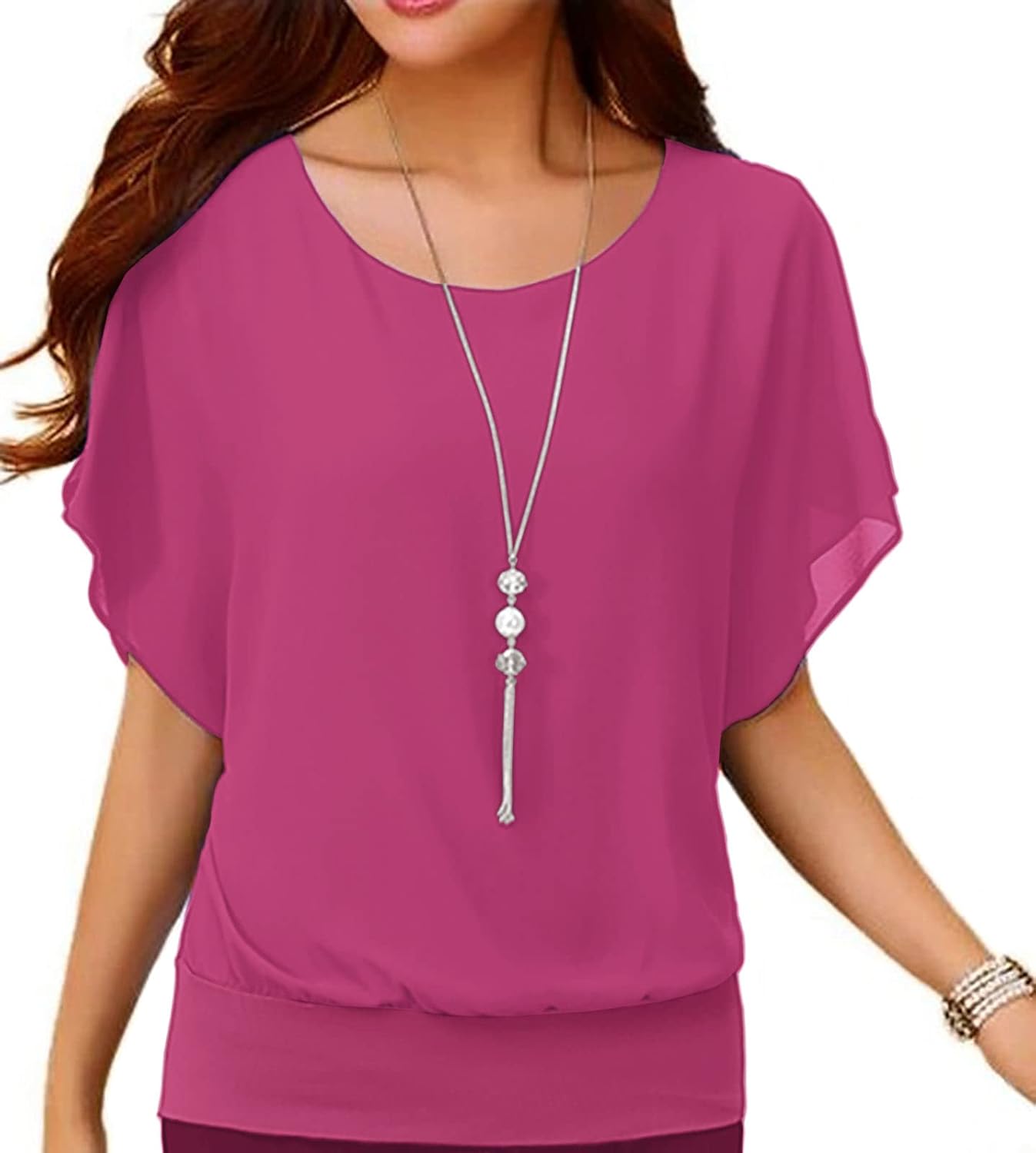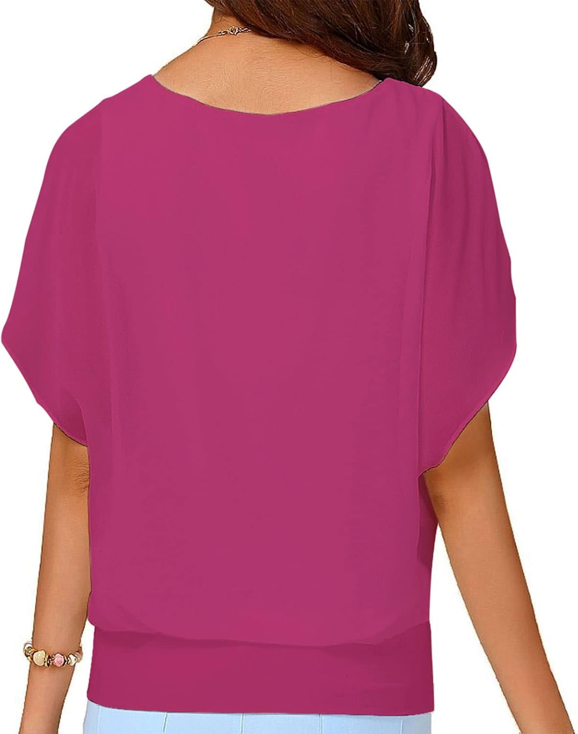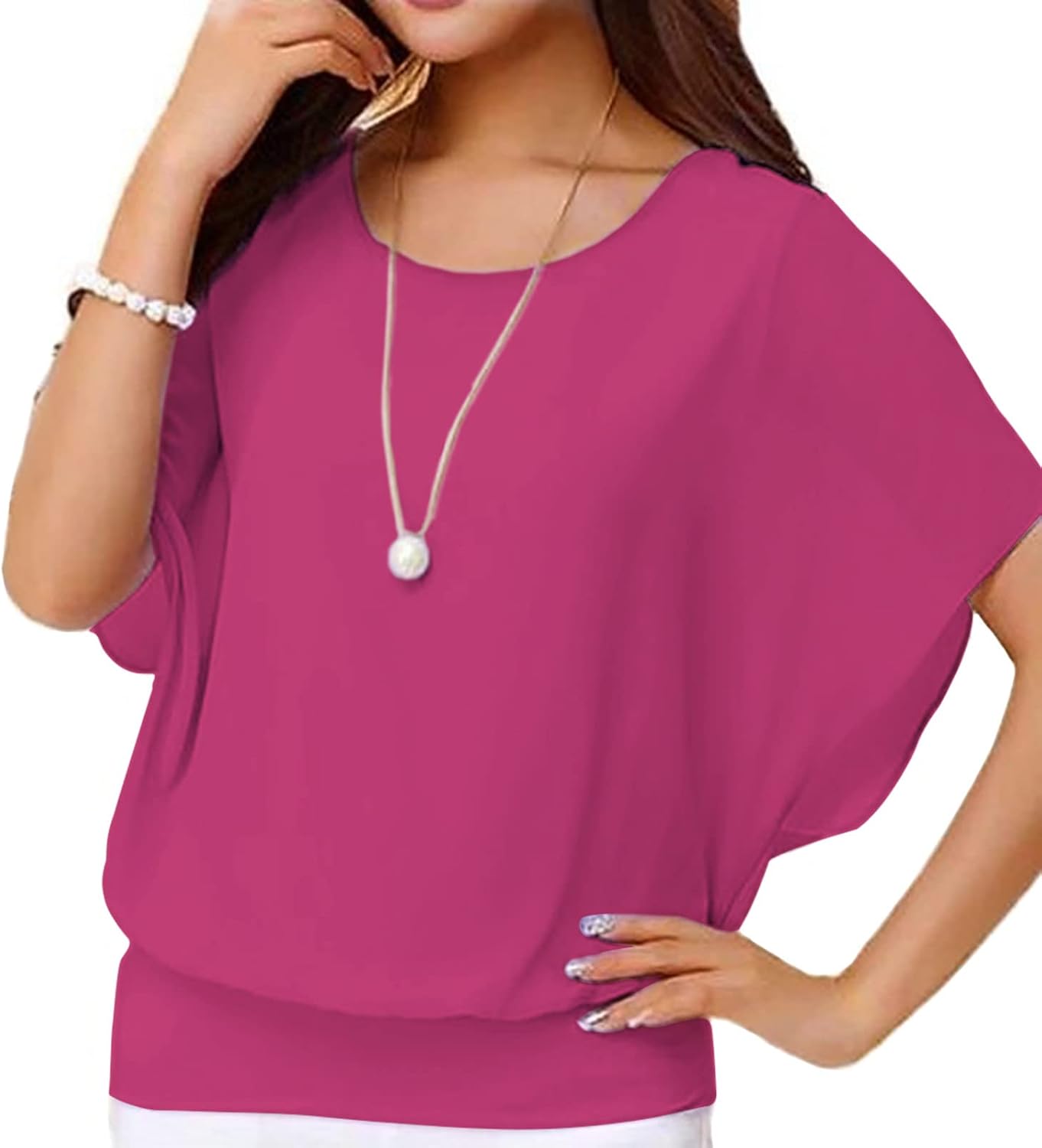*Women Floral Printed Casual Short Sleeve Round Neck Fit Slim Batwing Chiffon T-shirts Elegant Tops Blouse