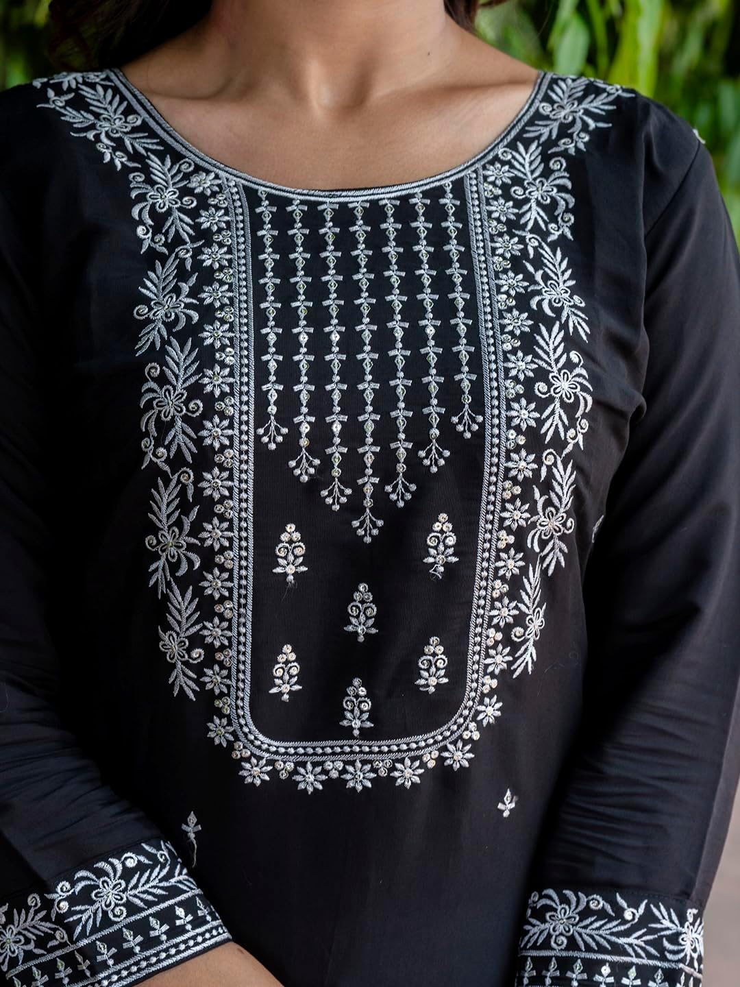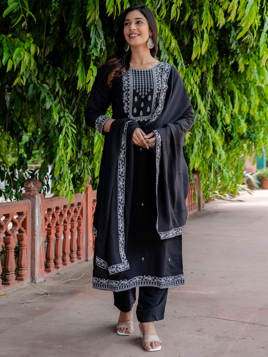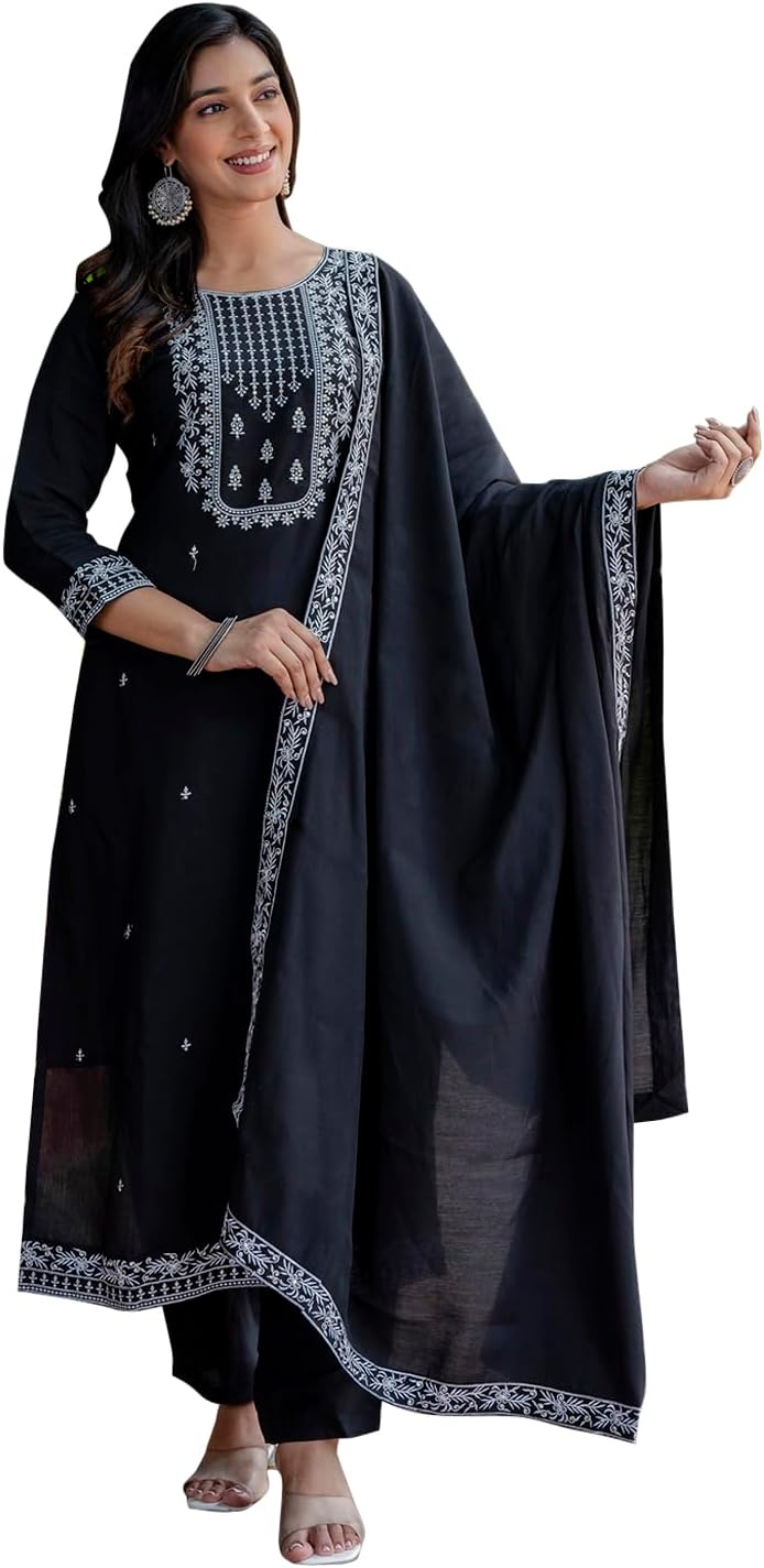 VredeVogel Women’s Kurta Pant Set with Dupatta | Embroidered Viscose Roman Silk Kurta Set for Women