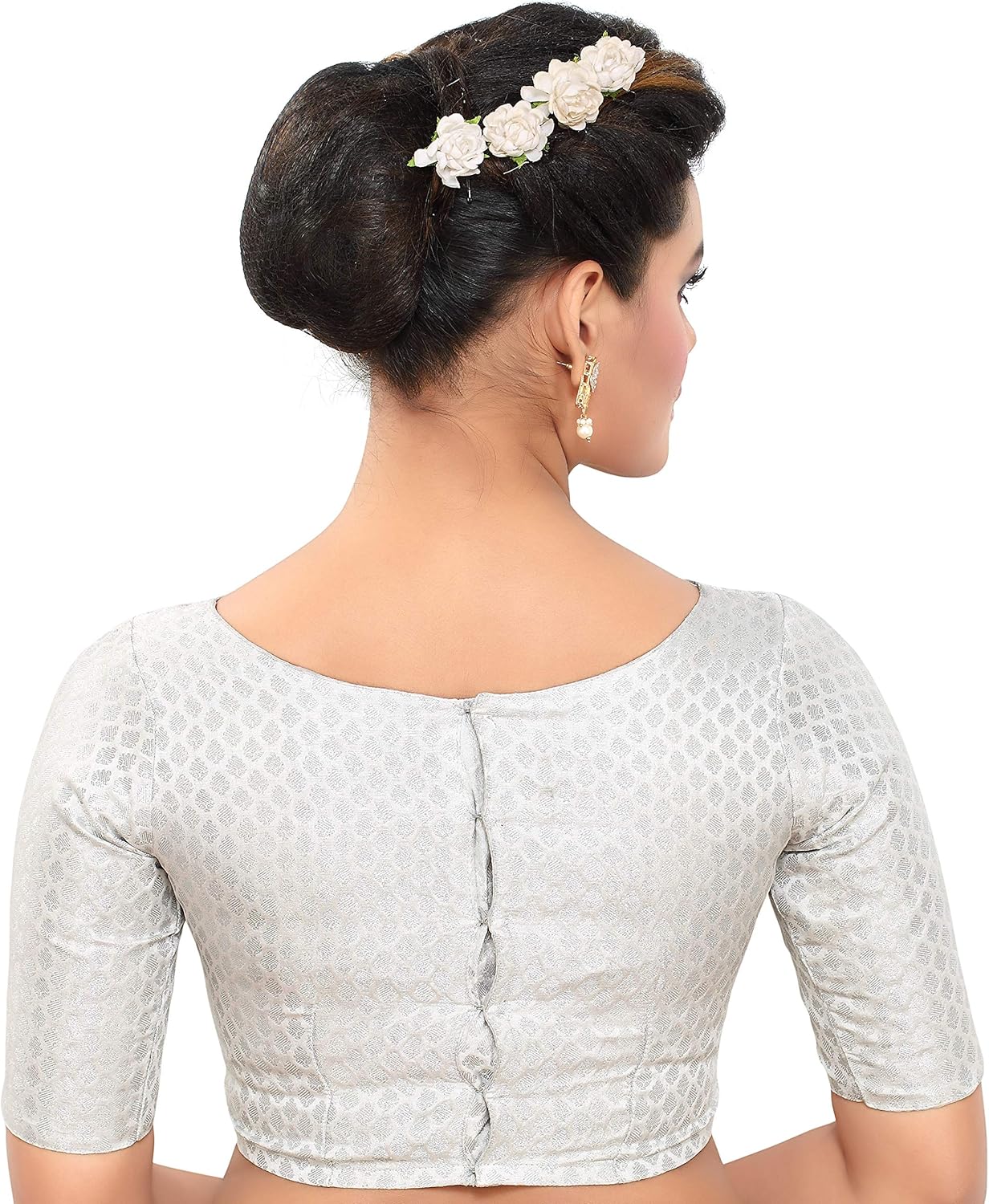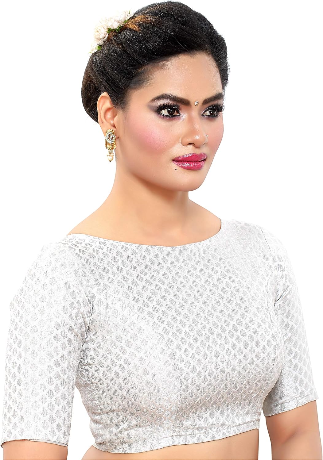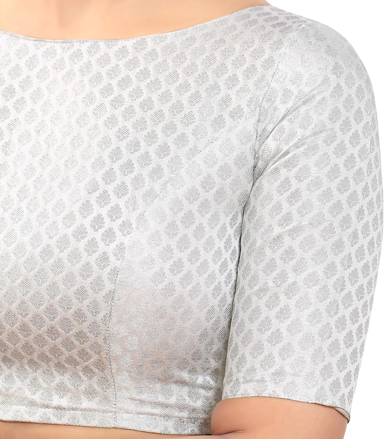 This is Madhu Fashion’s New Rich Banaras Brocade Radymade Saree Blouse in Silver Colour. This Blouse has Elbow Length Sleevs and a Boat Neck Design. This Blouse is lined with Pure Cotton for Extra Comfort.