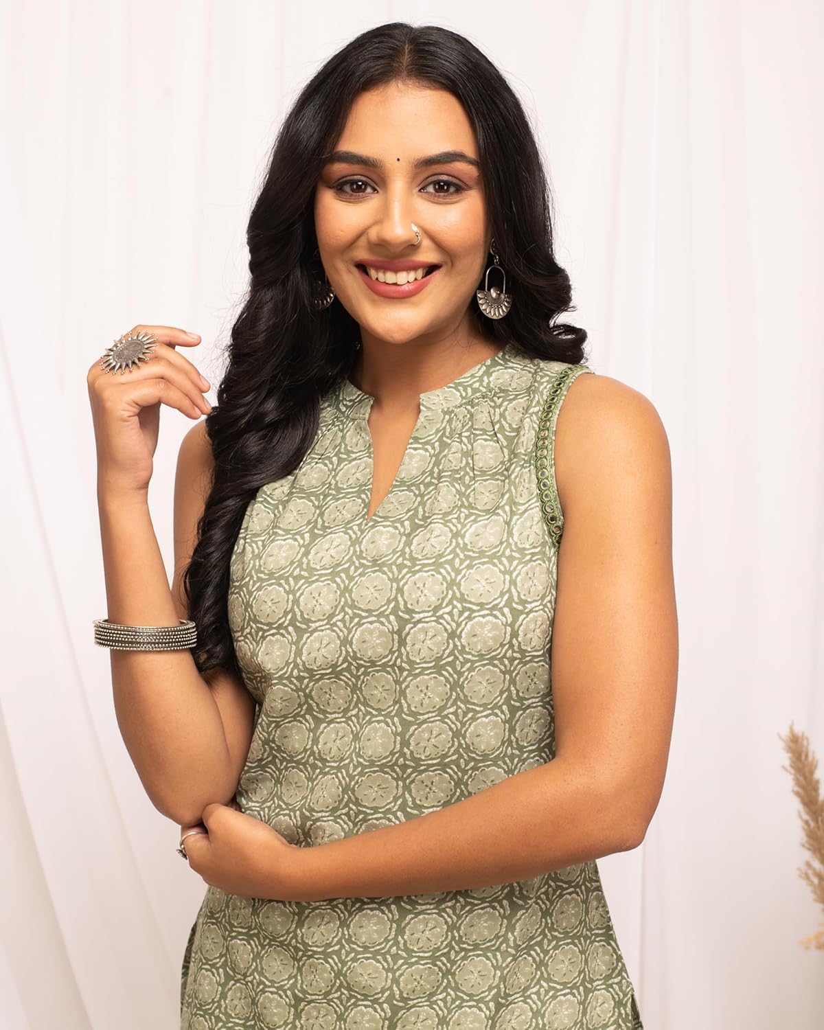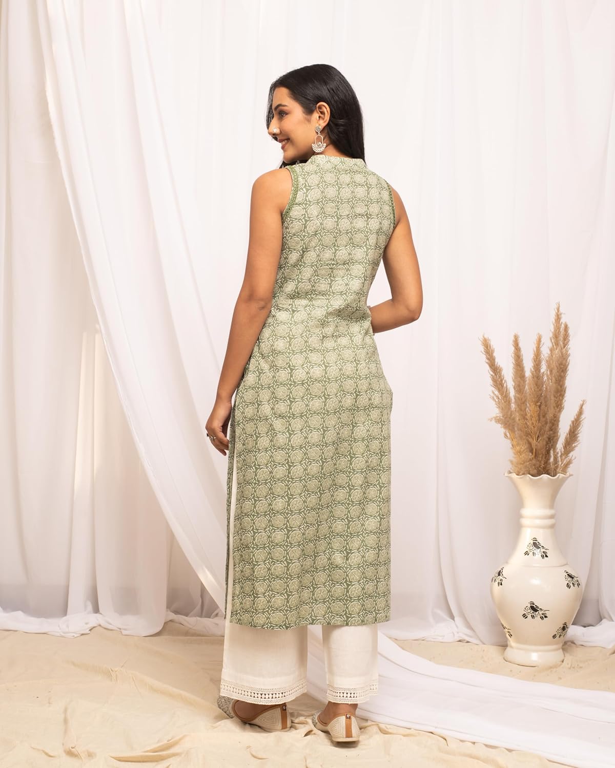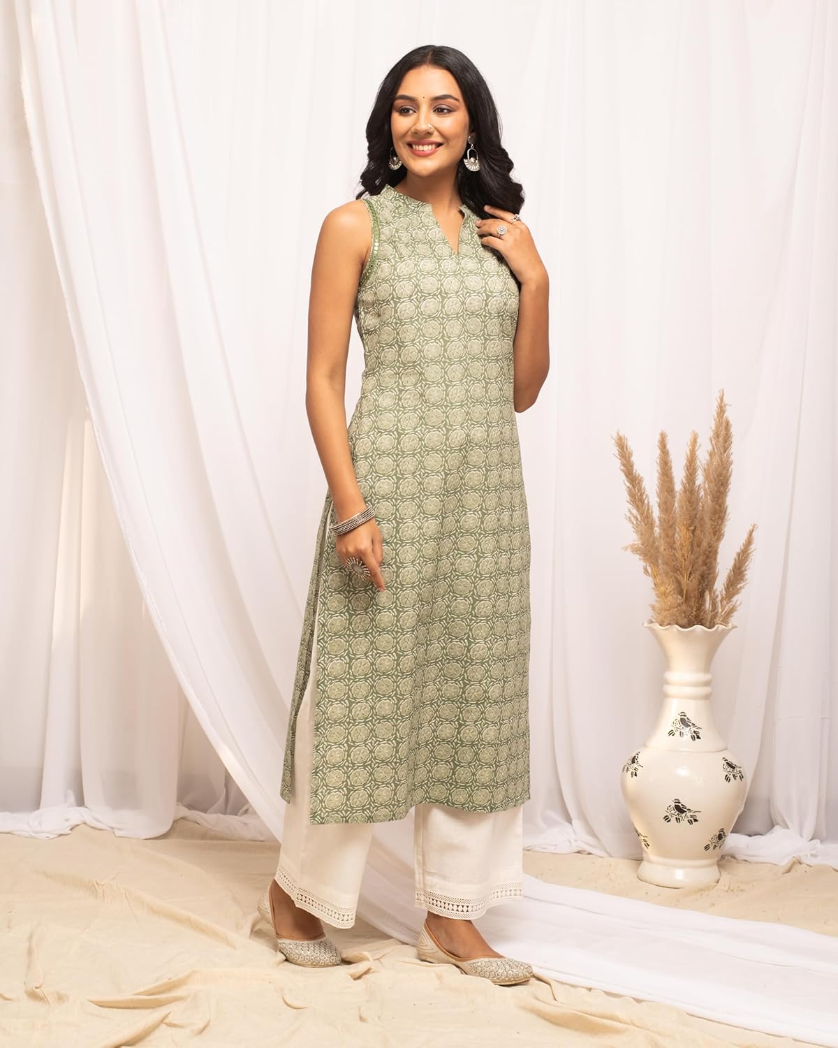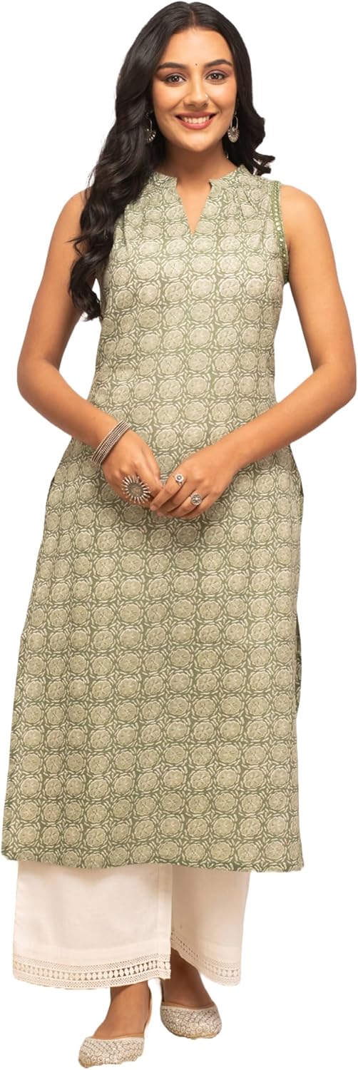 Leave a lasting impression on your peers by wearing this light green kurta from FIORRA. Tailored to sartorial perfection from premium quality fabric, it assures a soft and soothing touch against the skin. The V-neck elevates its design. The sleeveless further speak for itself. The floral print makes it a bewitching choice.