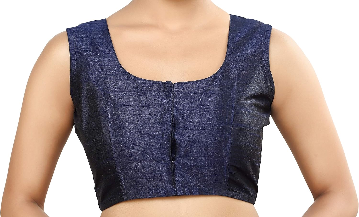 A Fully Stitched Non-padded Sleeveless Readymade Blouse with an Embroidered Design at the Back. This Blouse has Round Neck Design in Front and Boat Neck Design at the Back. It opens from the front with Hooks as the Closure type. Pure Cotton Inner Lining is provided for Xtraa Comfort and Margins for Xtensions are also provided. Available in Attractive Six Colours and 5 Sizes.