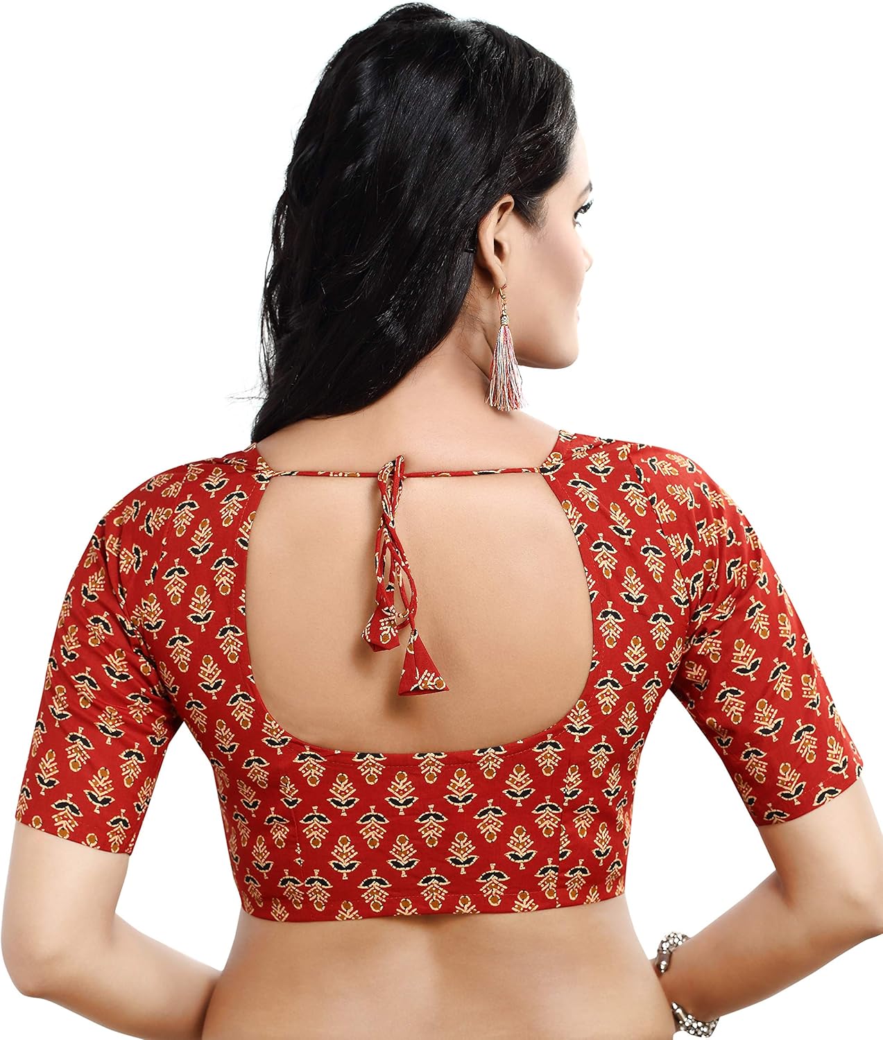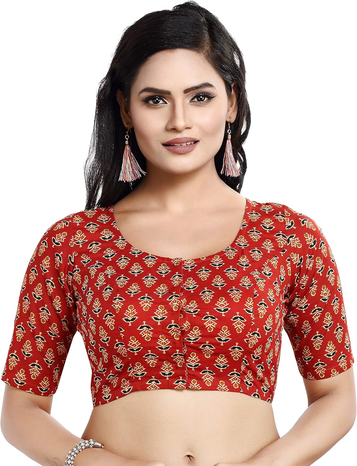 An Elegant looking Floral Printed Readymade Saree Blouse made from Pure Cotton with Round Neck Type and Elbow Length Sleeves. This Blouse has a Front Opening and with Hook & Eye as the Closure Type.. No Inner Lining is provided in this Blouse. Margins for Xtensions are available.