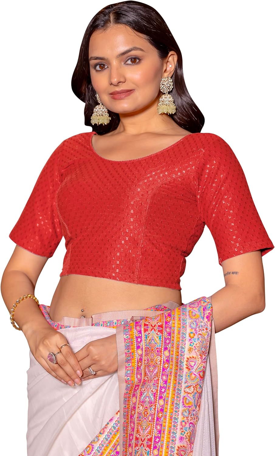 Women’s Round Neck Cotton Dobby Lycra Elbow Sleeve Readymade Saree Blouse
