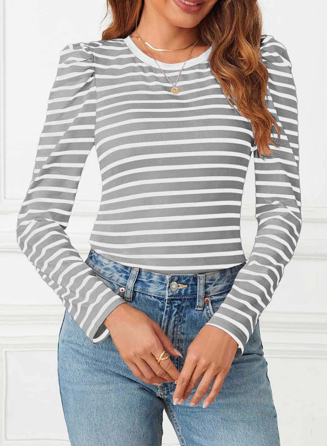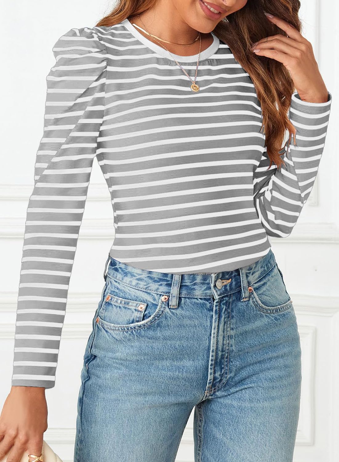 Women’s Striped Long Sleeve Shirt Crew Neck Puff Sleeve Top Casual Blouses