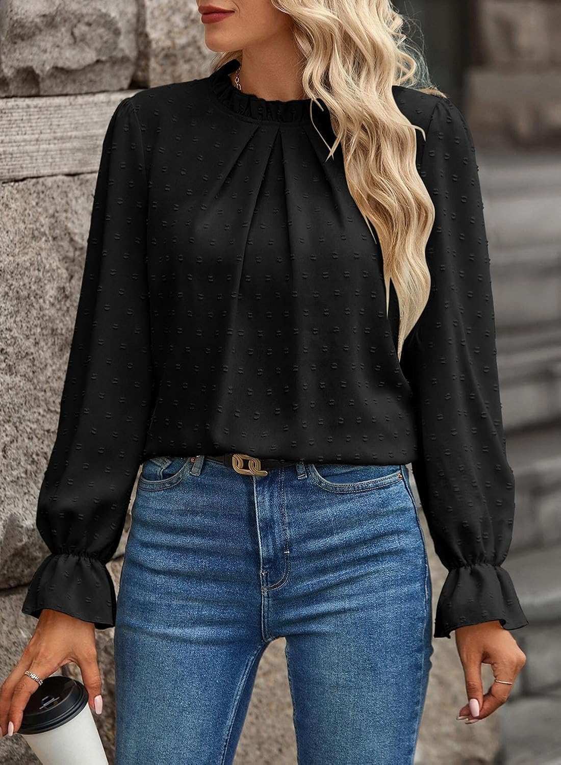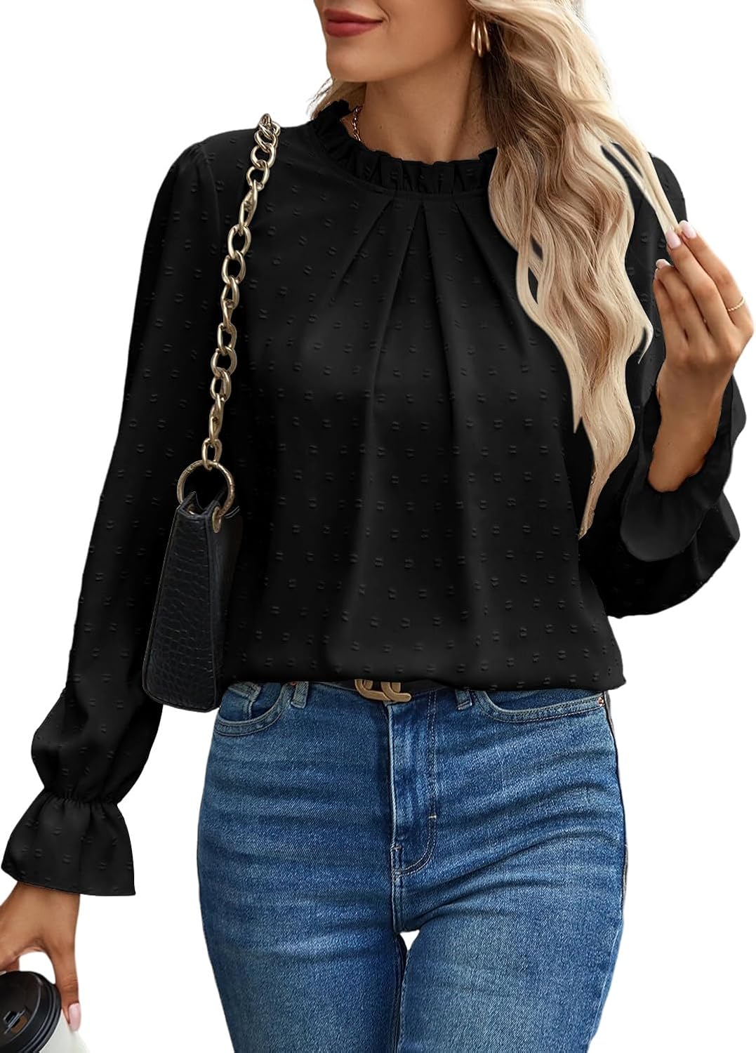Women’s Swiss Dot Shirt Ruffle Long Sleeve Pleated Crewneck Blouse Casual Loose Tops